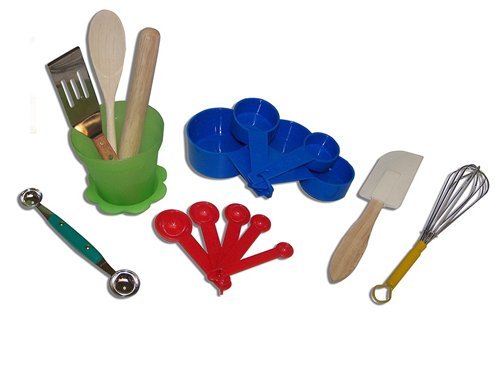 - Sassafras children's kitchen tools-includes measuring cups & spoons. wooden spoon. rolling pin, spatula, melon balller, pastry scraper, Herb pot & whisk and everything is in the herb pot