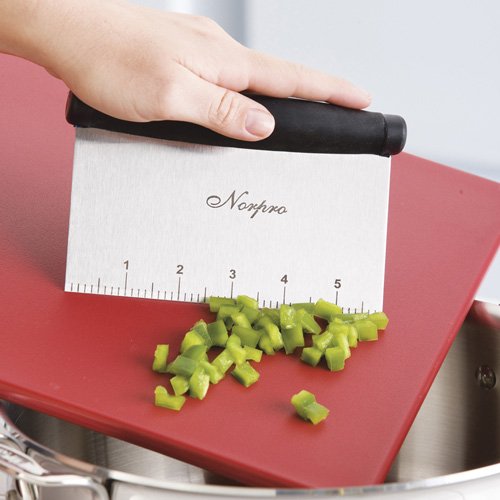 Grip-Ez 6" x 4" Chopper/Scraper. Heavy duty stainless steel blade is sharp and durable. Soft santoprene handle for a strong, comfortable grip. Measuring guide, dishwasher safe,. 6" x 4" overall size.