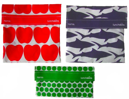 LunchSkins Reusable Sandwich and Snack Bags Set - 3 Pack - Red Apple, Navy Shark, Green Dots. Help reduce the 20 million single-use plastic sandwich bags that go into U.S. landfills daily by using the LunchSkins Reusable Sandwich and Snack Bags Set. Before first use, each bag should be turned inside-out, washed, and completely dried. The colors will fade and the fabric will soften with repeated use and multiple washings. You can personalize each LunchSkins bag by using a permanent marker on the nameplate. Lunchskins are versatile and can hold numerous items including crackers, cookies, dog treats, wallets, keys, ice, baby pacifiers, baby toiletries, cosmetics, crayons, legos, travel toothpaste, and toys.